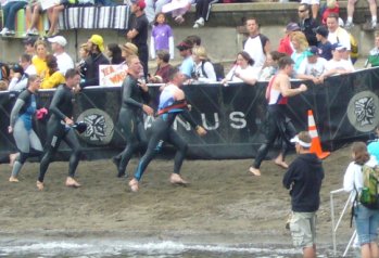 That's me pealing off my Helix wetsuit as I run up the beach into T1.