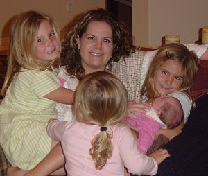Girl power! Grace meets her cousins Morgan (holding Grace), Elizabeth (cute blonde), and Anna (not facing the camera) La Quinta, CA 11-24-2005 |