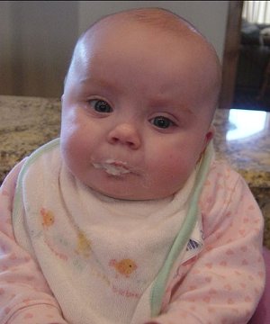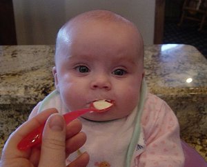Grace eats her first non-liquid food - rice cerial! Hmmm. Cedar Hills, UT 2-13-2006 |